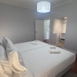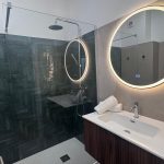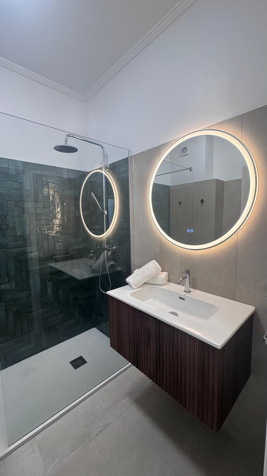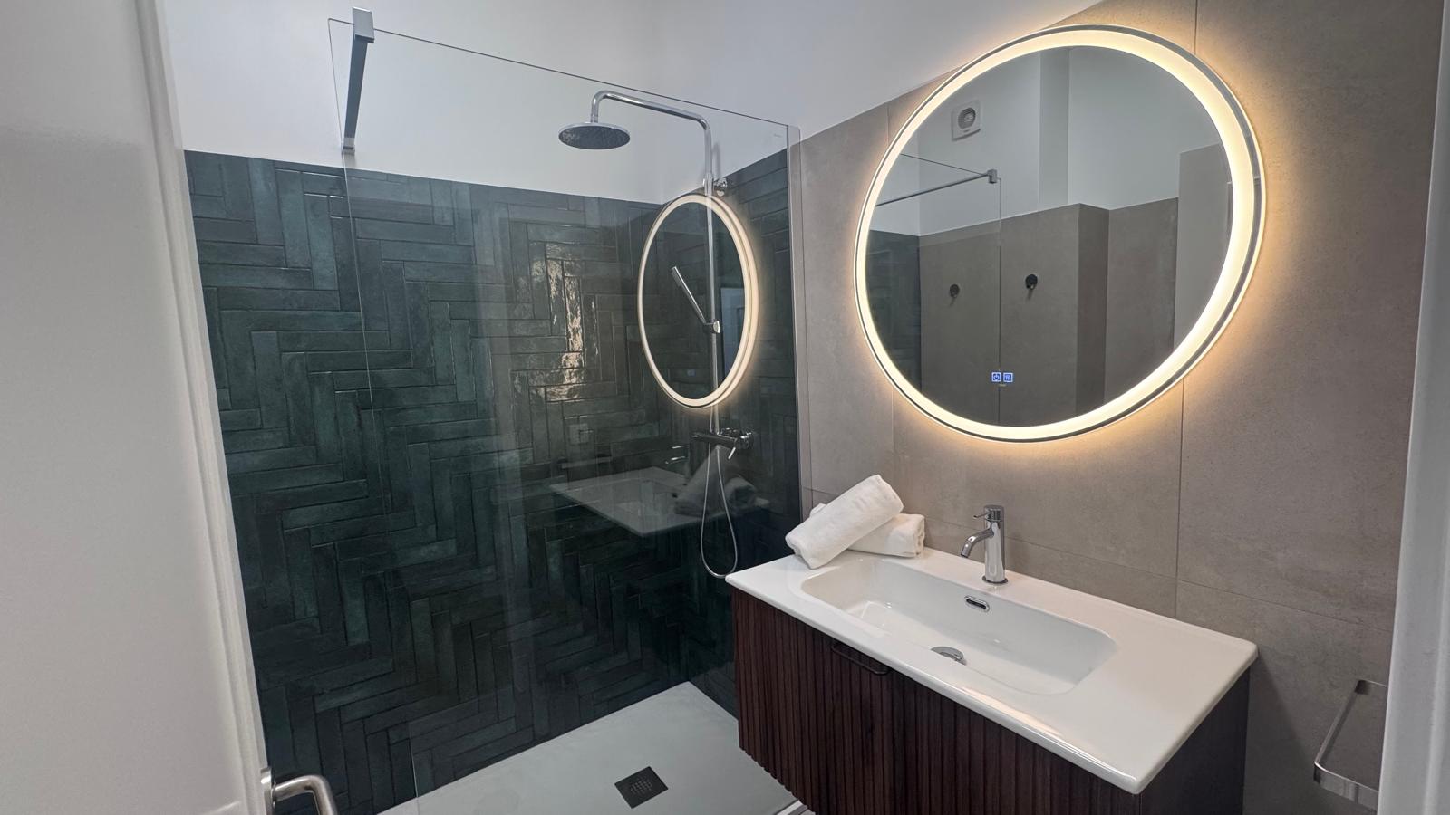 The main bedroom was designed for rest and relaxation: a king-size bed (or twin beds upon request), high-quality linens, and a practical, elegant storage area. The bathroom showcases a modern design with a large shower, LED mirror lighting, and premium finishes.