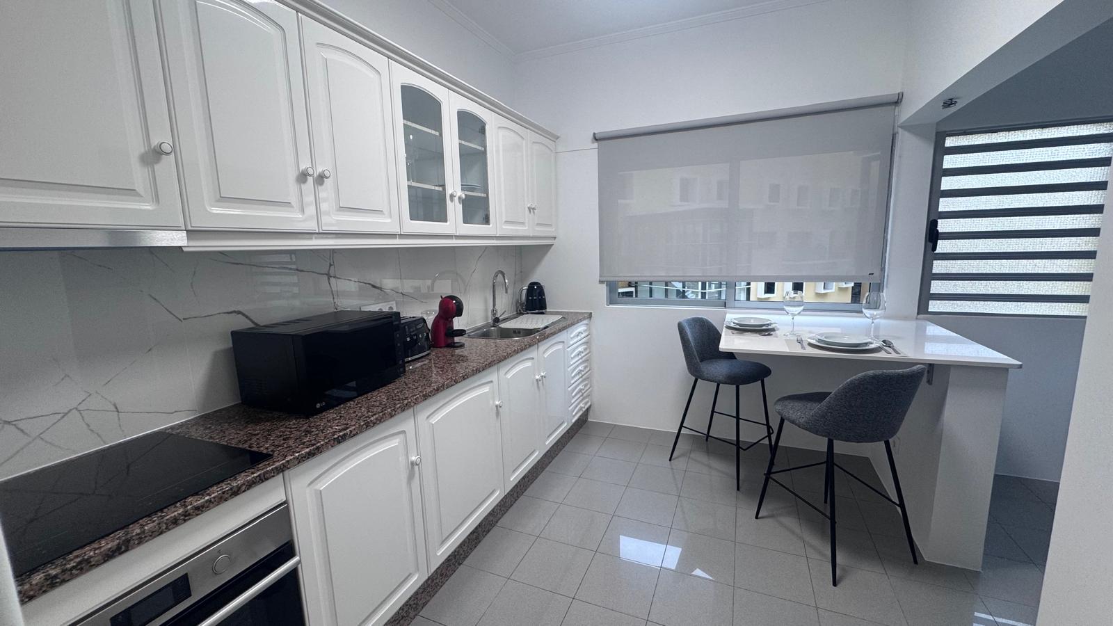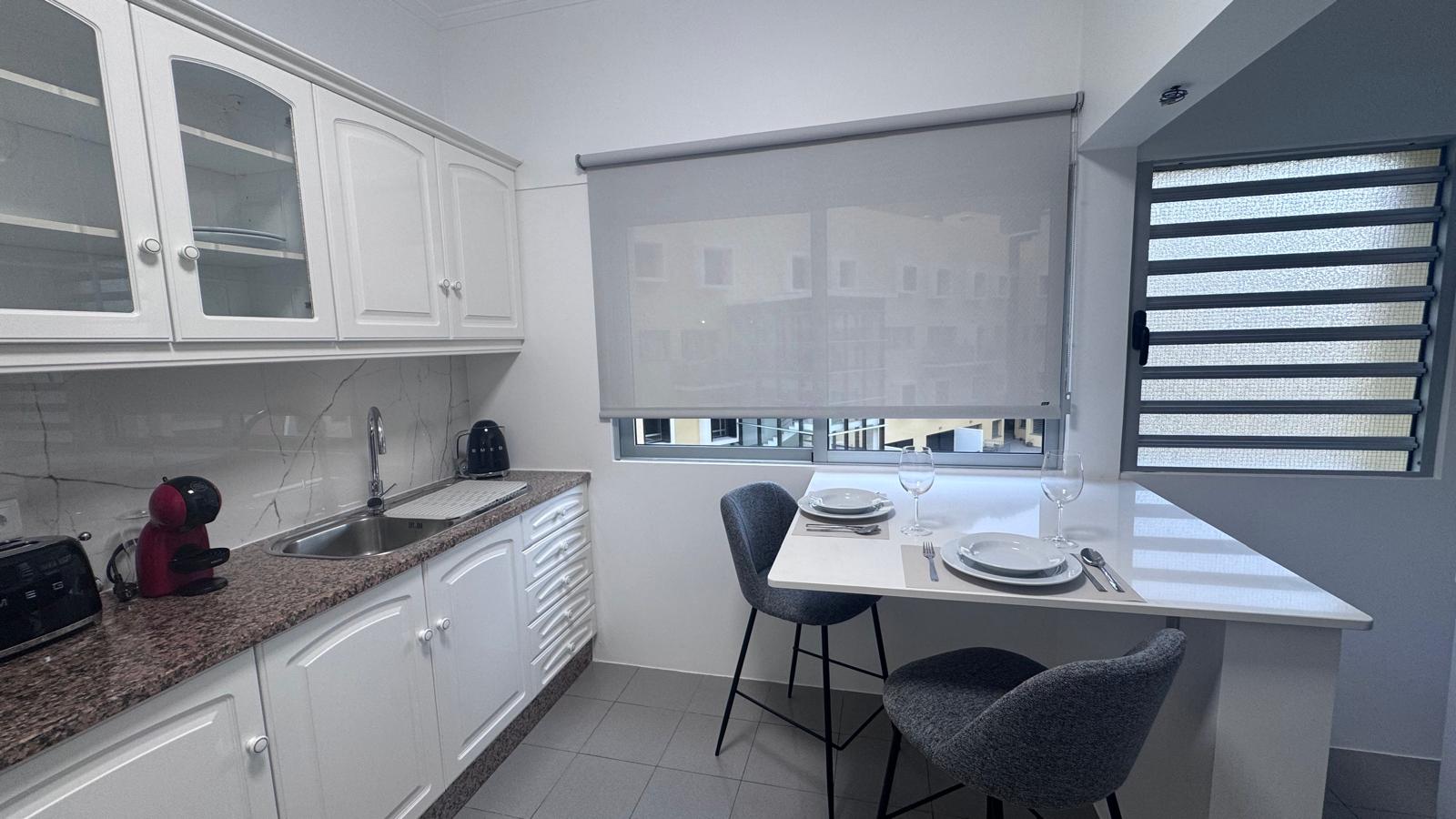 The apartment features a bright and spacious living room, equipped with a comfortable sofa, Smart TV, and air conditioning — the ideal space to relax after a day exploring the island. The fully equipped kitchen offers all the utensils you need to prepare your meals, including an oven, electric hob, microwave, toaster, and coffee machine.